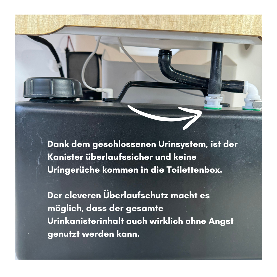 Eine LED-Anzeige leuchtet kurz bevor der 9 Liter Urin-Tank voll ist. Ein Überlaufschutz sorgt für zusätzliche Sicherheit.