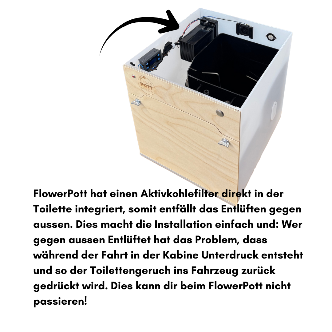 Die Nutzung des Flower Potts ist geruchfrei - sogar wenn du auf dem Pott sitzt und dein Geschäft erledigst, riechst du nichts, da die Belüftung alle unangenehmen Gerüche sofort durch den Aktivkohlefilter leitet und so für ein geruchfreies Toiletten-Erlebnis sorgt.