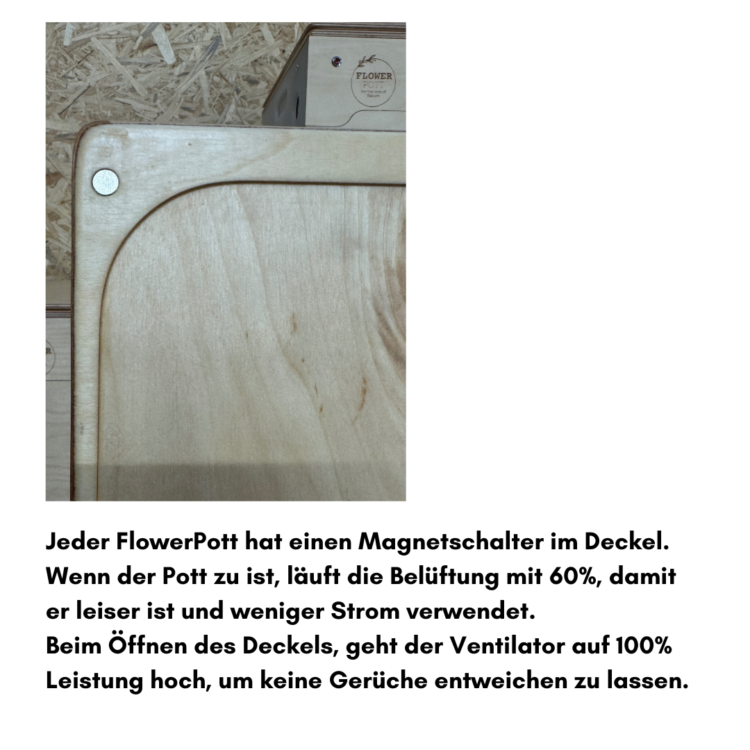 - Ein Magnetschalter sorgt beim Öffnen der Toilette für 100% Leistung der Ventilatoren. Bei geschlossenem Toilettendeckel laufen sie mit gedrosselter Leistung (weniger Strom und weniger Lautstärke)